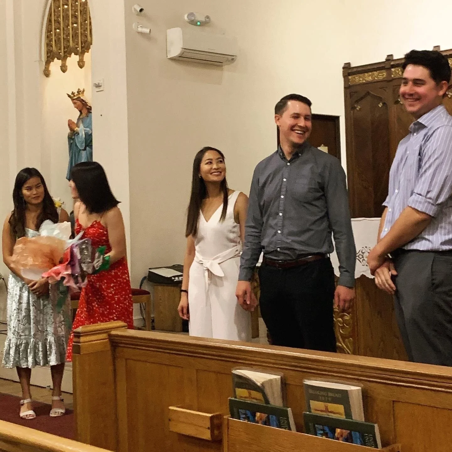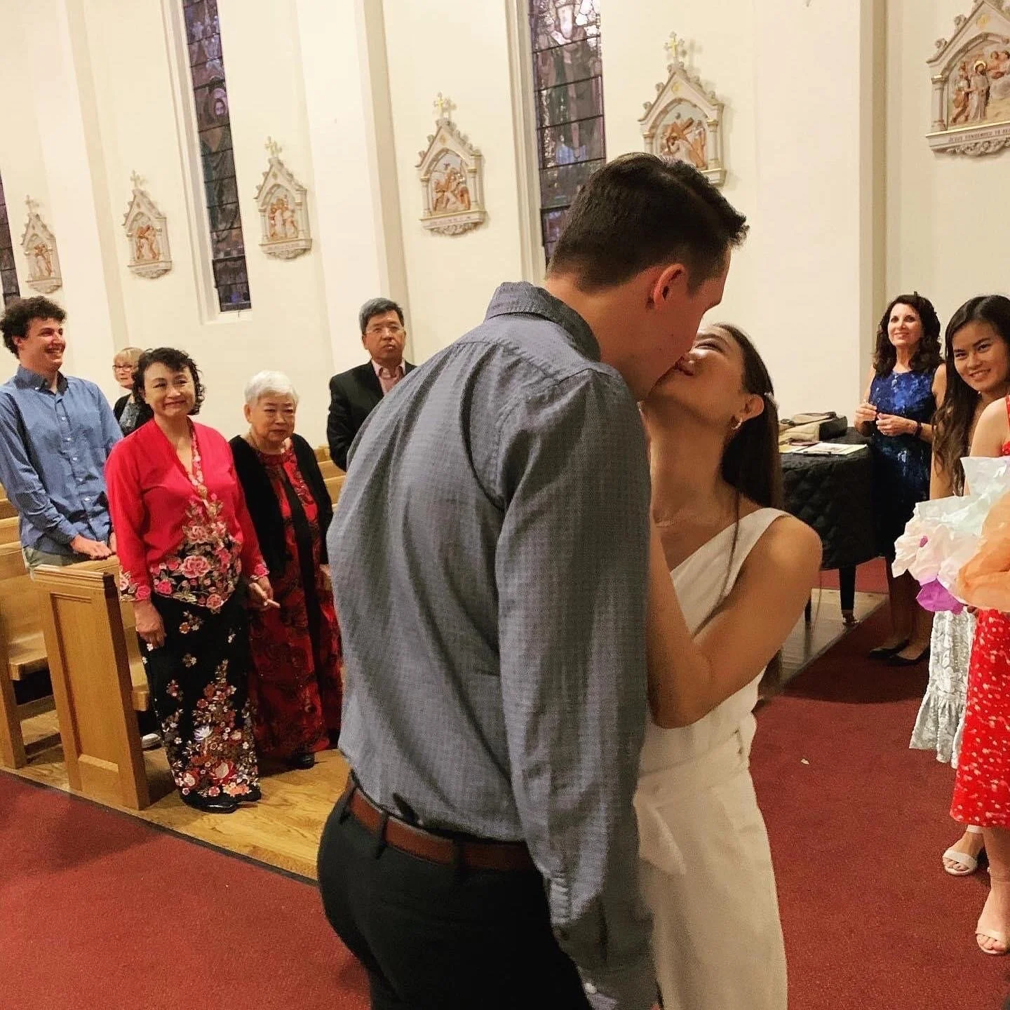My grandma, aunts, uncle and cousins who’d flown all the way out from Singapore were there waiting in the pews. A dear friend from Spain who had lived with us for a summer back when I was in college was there too. It was a joyous, chaotic reunion with lots of hugs and lots of confusion about who was walking down the aisle with whom. The poor wedding coordinator tried her best to keep us organized, but we were all too hopped up on adrenaline and happiness to pay much attention. I was half terrified that I wouldn’t remember all of the many steps and rituals required in a Catholic wedding ceremony, but I was mostly on cloud nine, surrounded by all of my loved ones. I hugged my mom and my dad and my brother tight, thankful to have such a wonderfully supportive, close-knit and loving family.